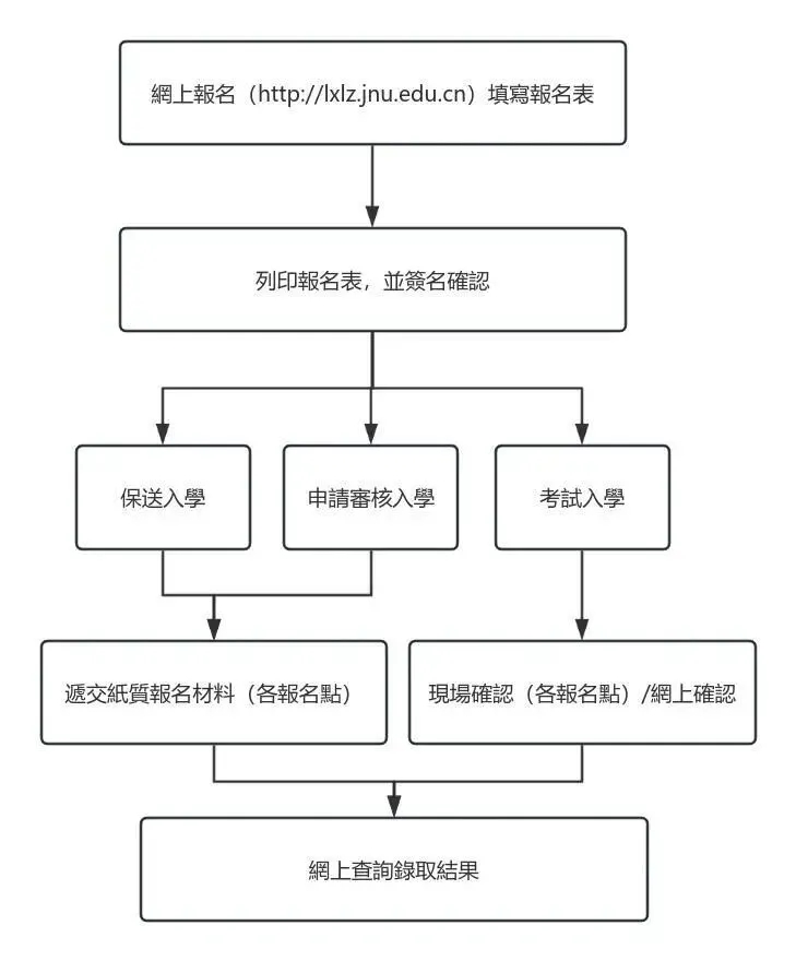 考生需登录报名网址填写报名信息,提交成功后系统将生成《暨南大学、华侨大学招收港澳台侨学生和华人及其他外籍学生报名表》(注意:表格不设下载链接),请打印报名表,核对无误后签字确认,并附上所需报名材料到各报名点办理现场确认(或网上确认),同时缴纳报名费。